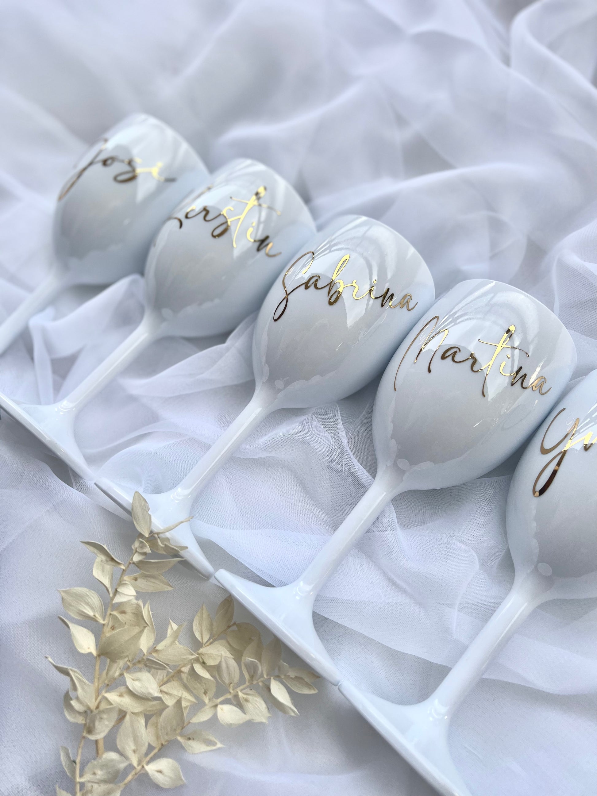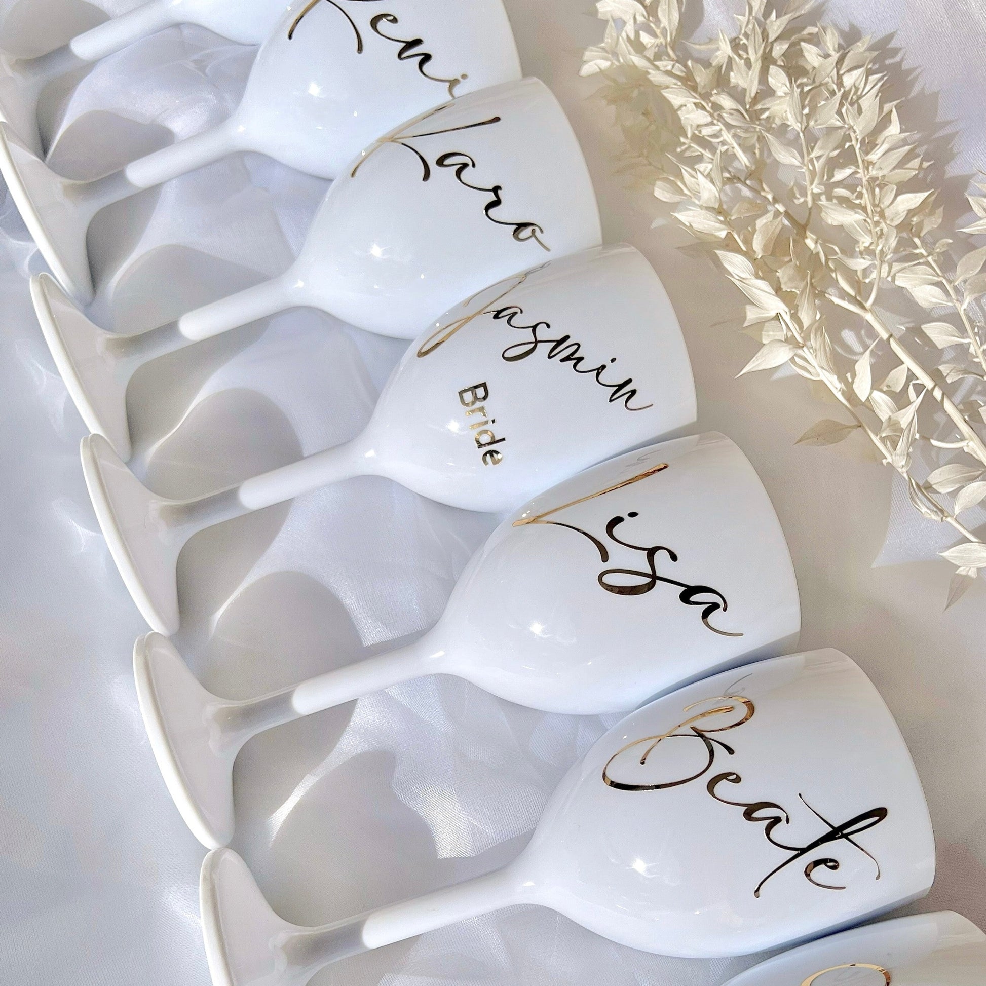 Jedes Glas wird mit einem Namen (z. B. Tina) eurer Wahl personalisiert. Solltet ihr einen Zusatz wünschen (z. B. „Bride“) wählt bitte die Option „Name und Zusatz“ aus.